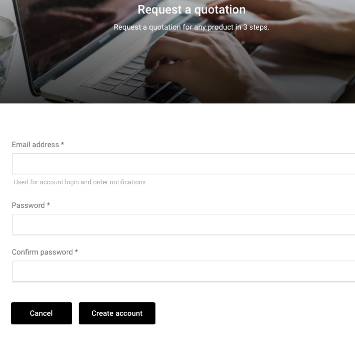 Ange e-postadress och lösenord för ditt offertkonto. Detta gör det möjligt för dig att begära en offert när du har valt de produkter du behöver.