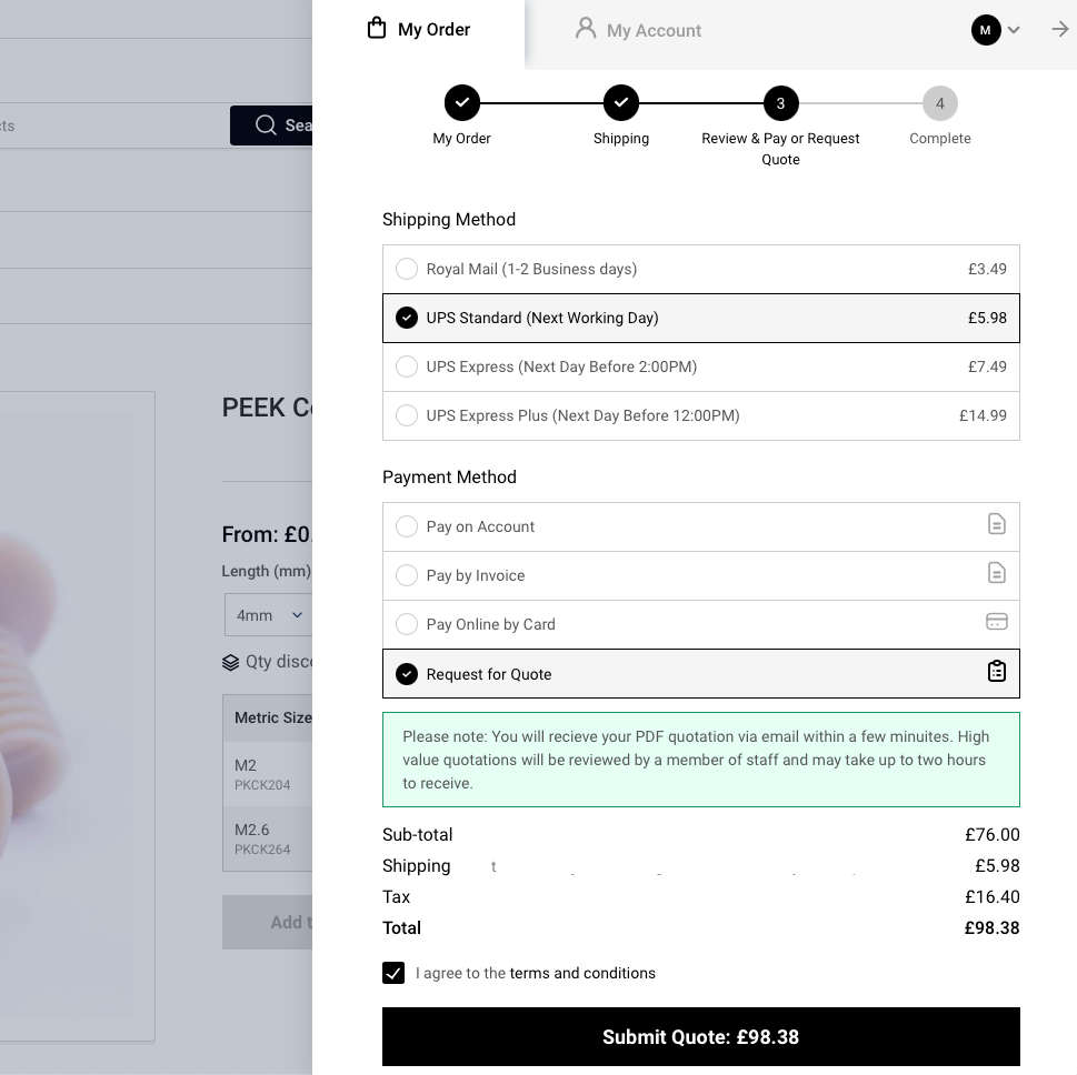 Följ den vanliga kassaprocessen fram till betalningsavsnittet och välj "Begär offert". Din förfrågan kommer att behandlas och du kommer att få en omedelbar offert via e-post.