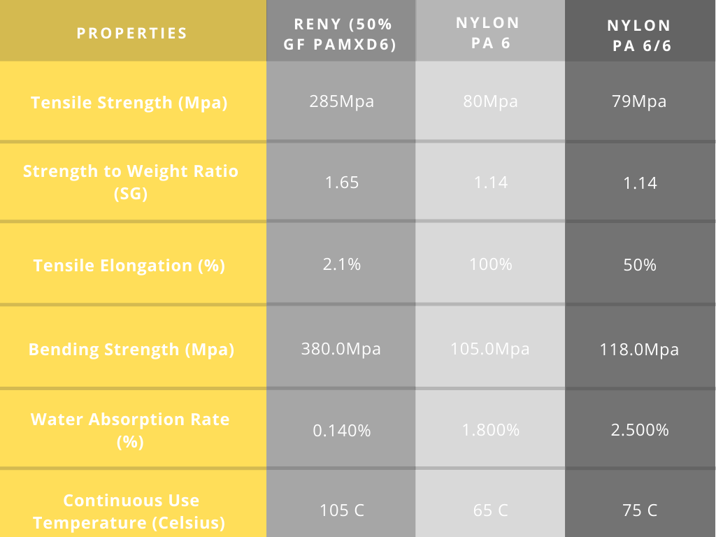 RENY:s struktur har liknande egenskaper som vanliga nylonskruvar, men den är förstärkt med 50% glasfiber, vilket gör den till en av de polymerskruvar på marknaden som har högst draghållfasthet. RENY har också en utmärkt oljebeständighet, vilket gör den till en vanlig syn inom fordonsindustrin.