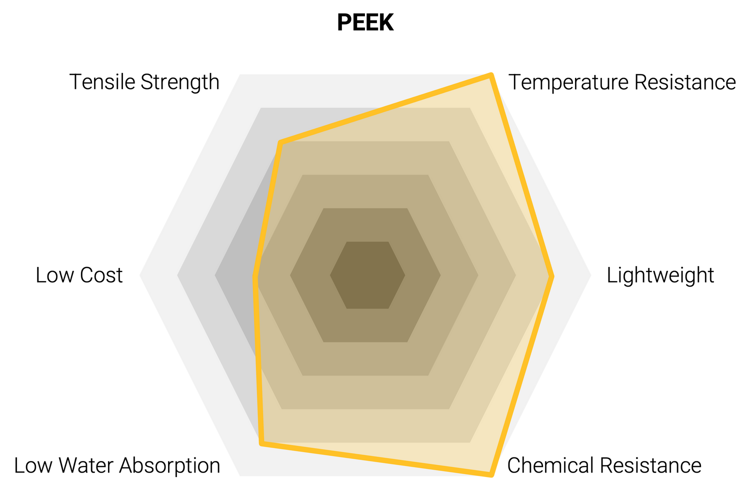 Följ länken nedan för att se vårt datablad PEEK . Detta inkluderar egenskaper som mekanisk, elektrisk, termisk och kemisk beständighet.