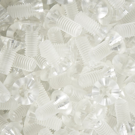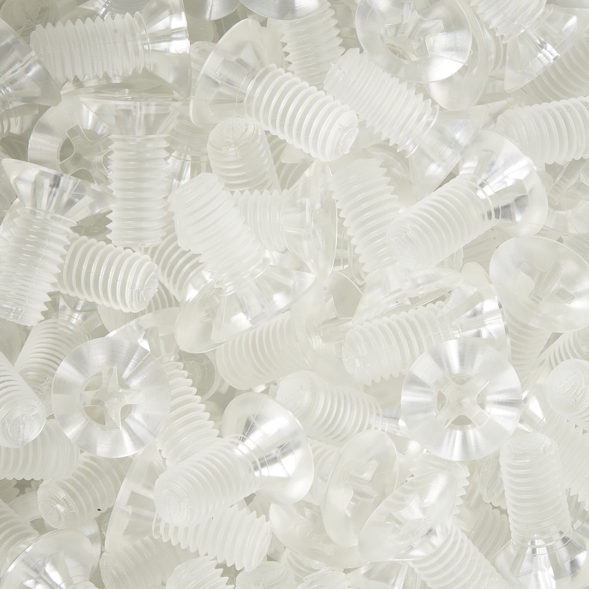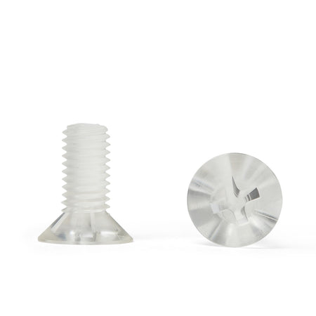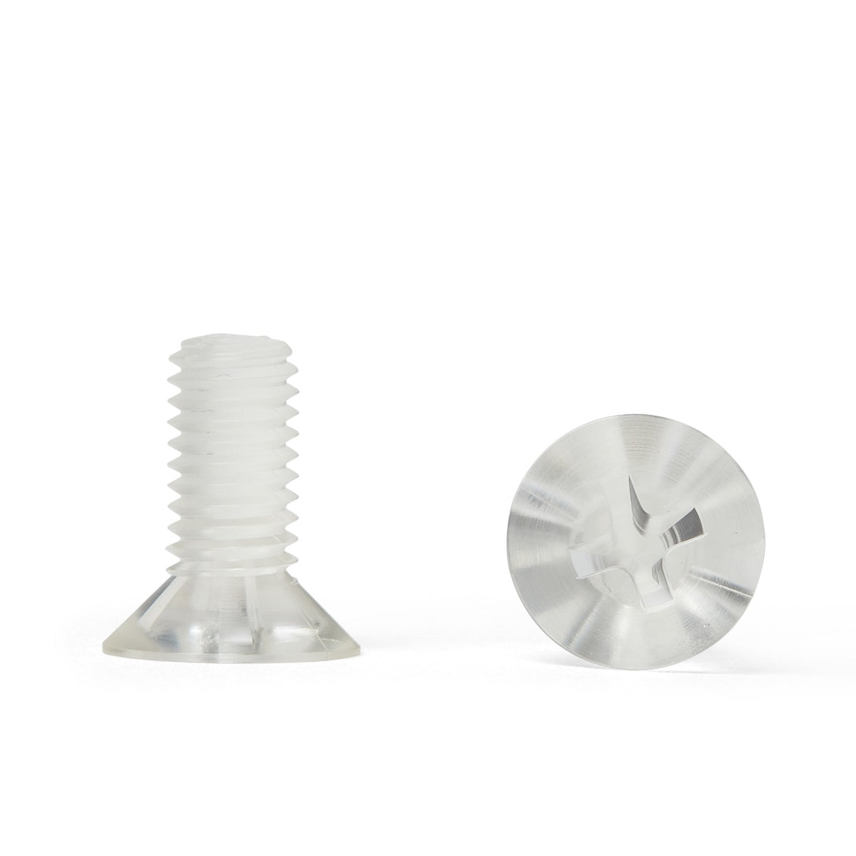Alla våra försänkta skruvar i polykarbonat (PC) (även kända som skruvar med platt huvud) uppfyller DIN 965-specifikationen och har transparent färg.