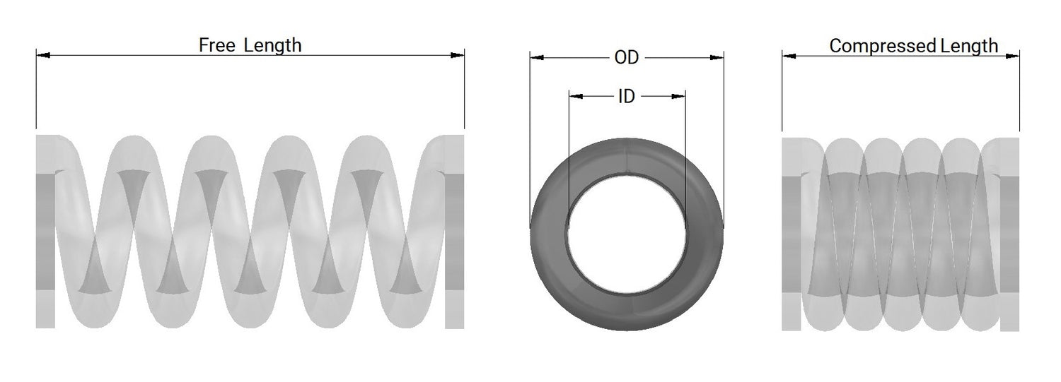Mått för Tryckfjädrar av polykarbonat i alla tillgängliga storlekar visas enligt produktritningen ovan.