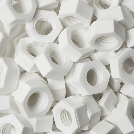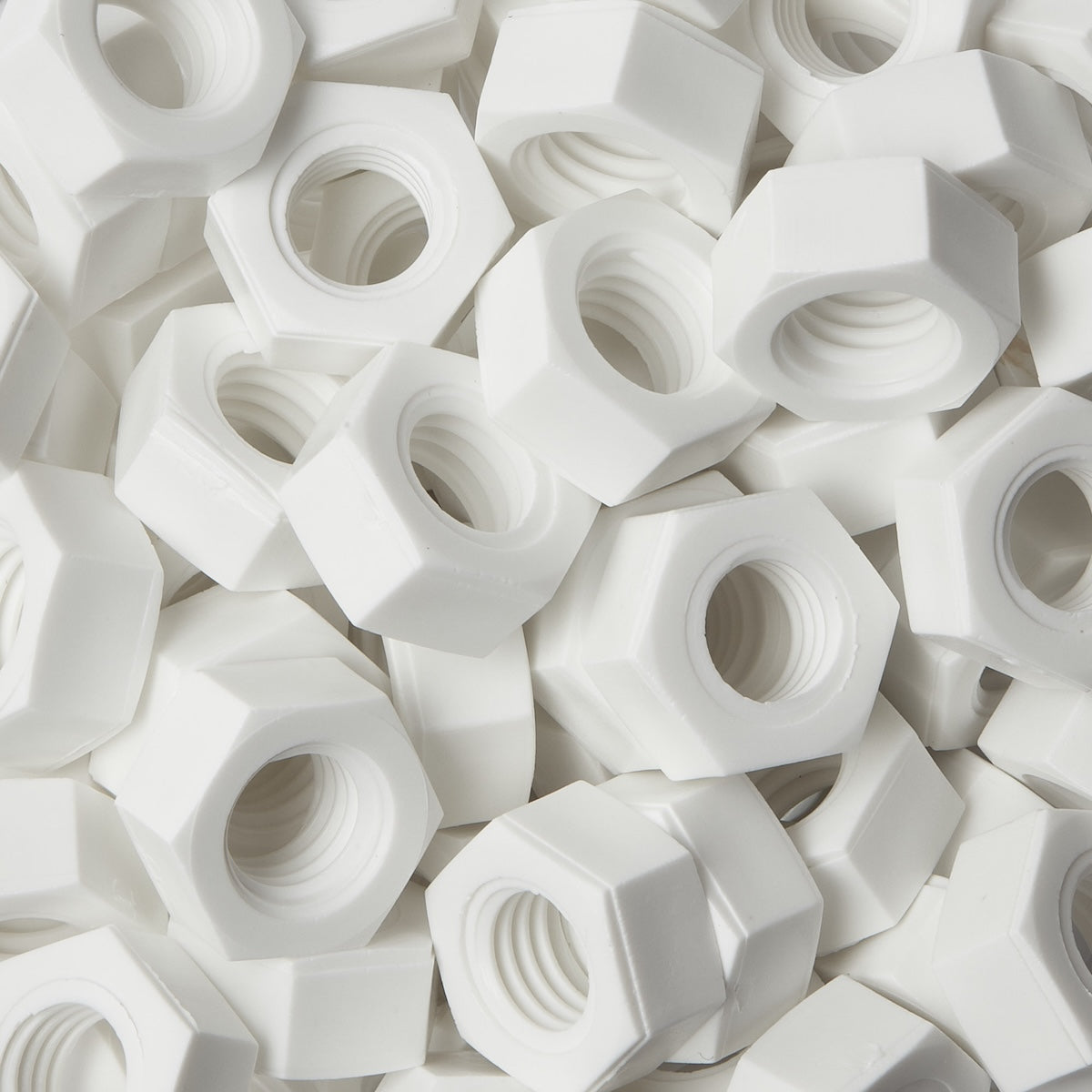 Sexkantmuttrar i polypropylen (PP) uppfyller DIN 934-specifikationen och kan användas i kombination med en rad fästelement i olika material beroende på tillämpning. Finns i metriska standardstorlekar (M4- M12).