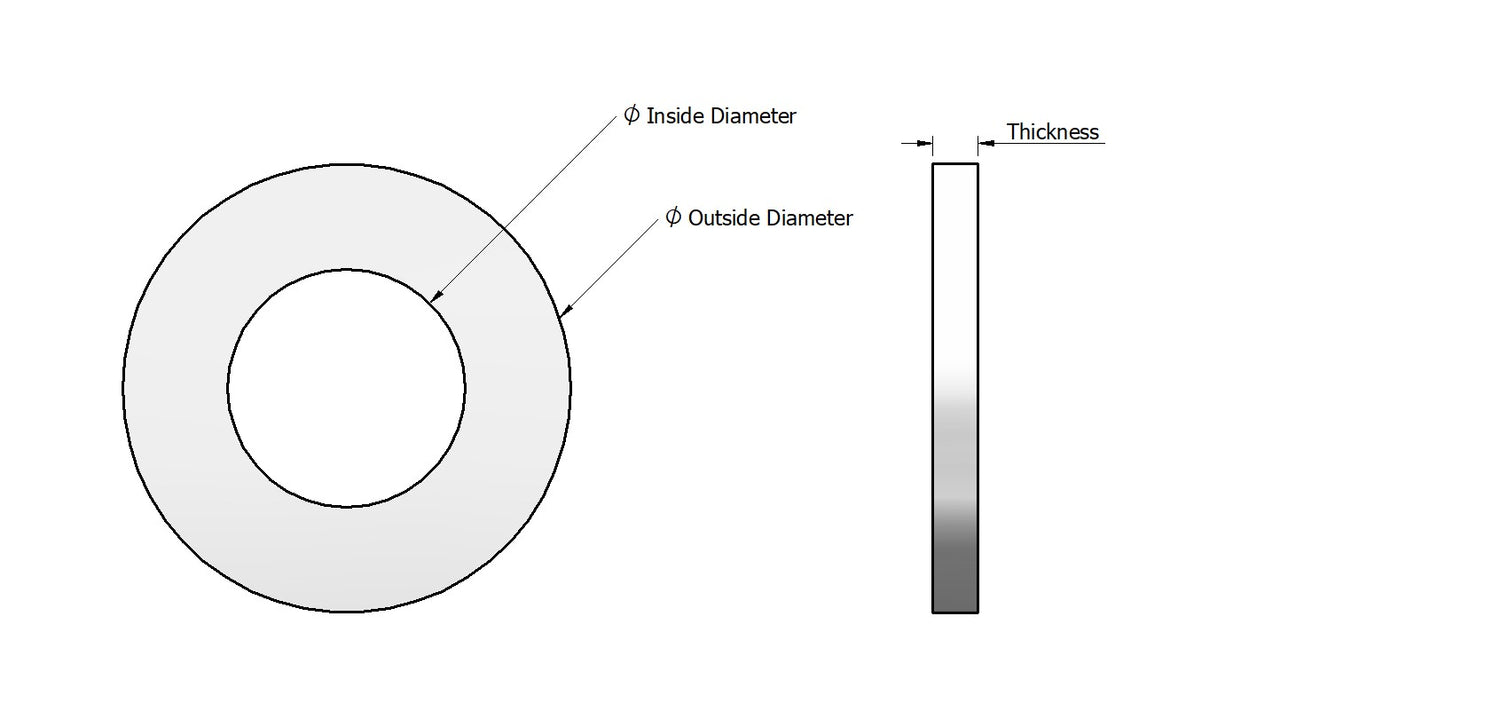 Mått för PTFE Teflon Platta brickor i alla tillgängliga storlekar visas enligt produktritningen ovan.