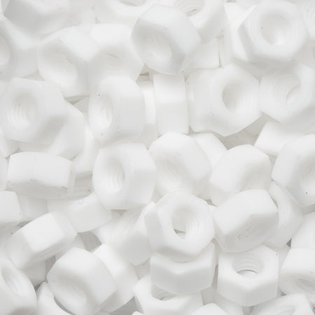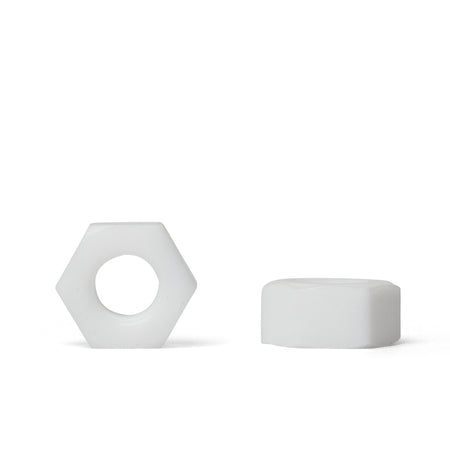 Våra PTFE- eller "Teflon"-sexkantmuttrar är tillverkade av 100% PTFE och ska inte förväxlas med belagt rostfritt stål. Genom att använda PTFE som enda material kan våra sexkantsmuttrar uppvisa exceptionella egenskaper utan kompromisser.